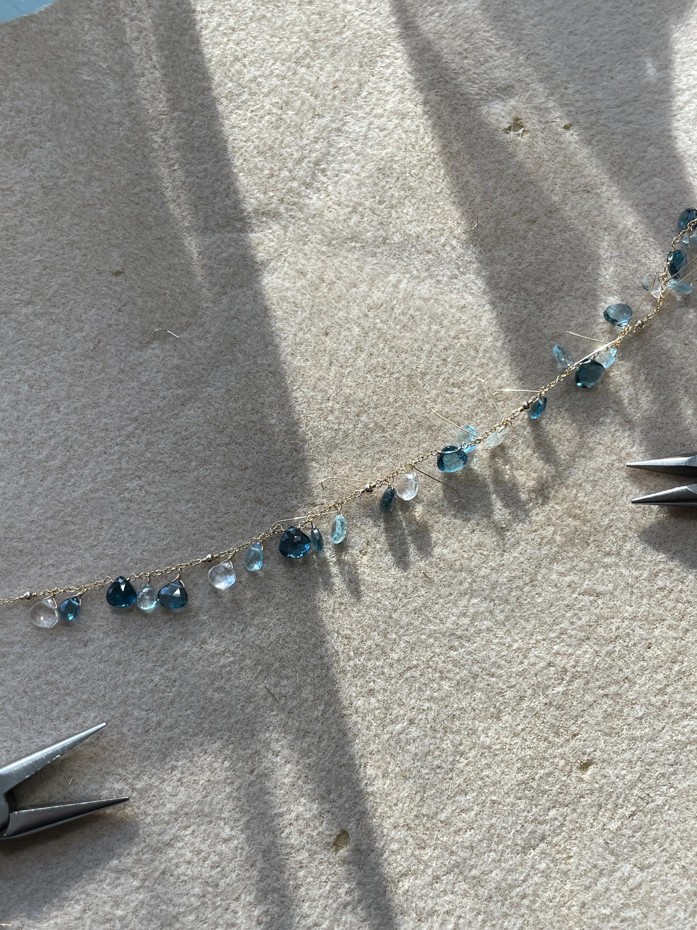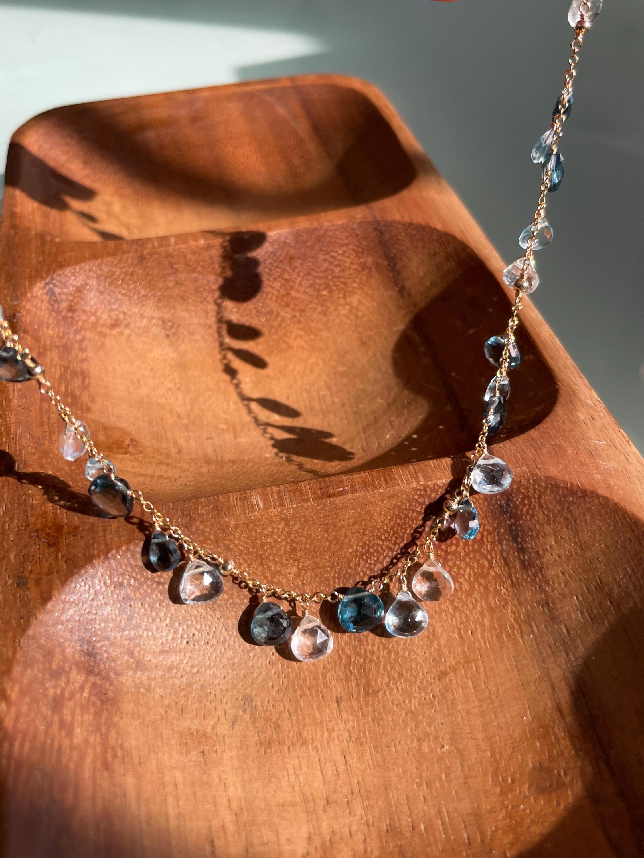 Turn heads with the newest Hannah May Confetti Necklace showcasing the most luxurious Topaz gemstones. Delicately built with different shades of high quality London Blue Topaz, Sky Blue Topaz and Clear Quartz. Exact gems used can differ slightly. Only two available. Reach out if you are interested in a custom color way. Slip it on for an instant pop of color that elevates everything from tees to evening wear.