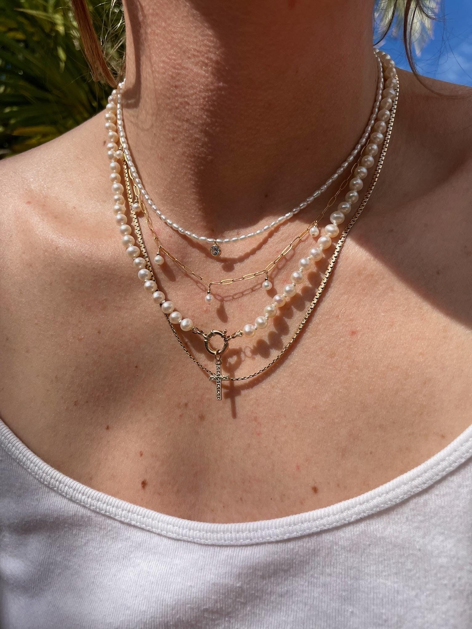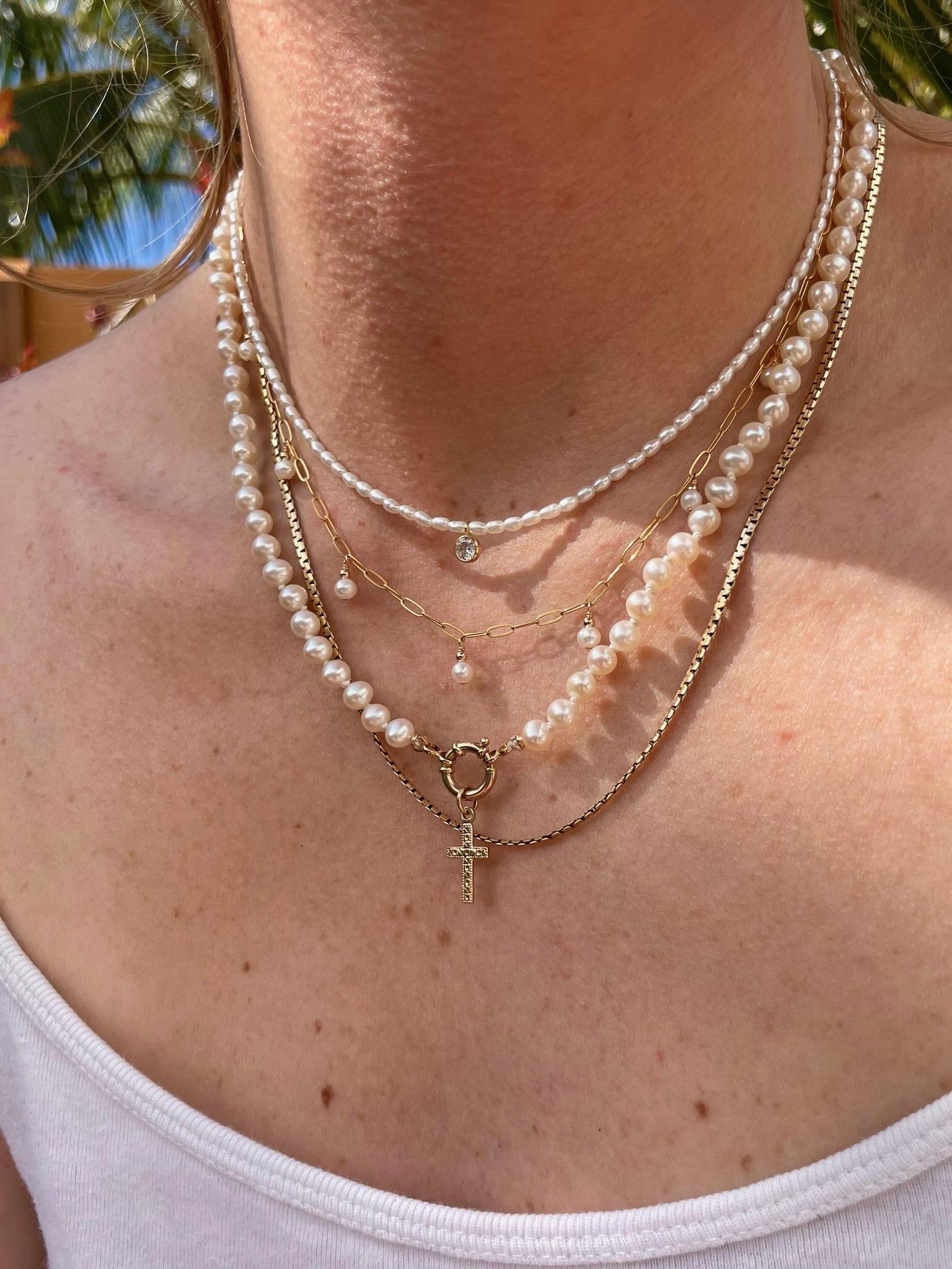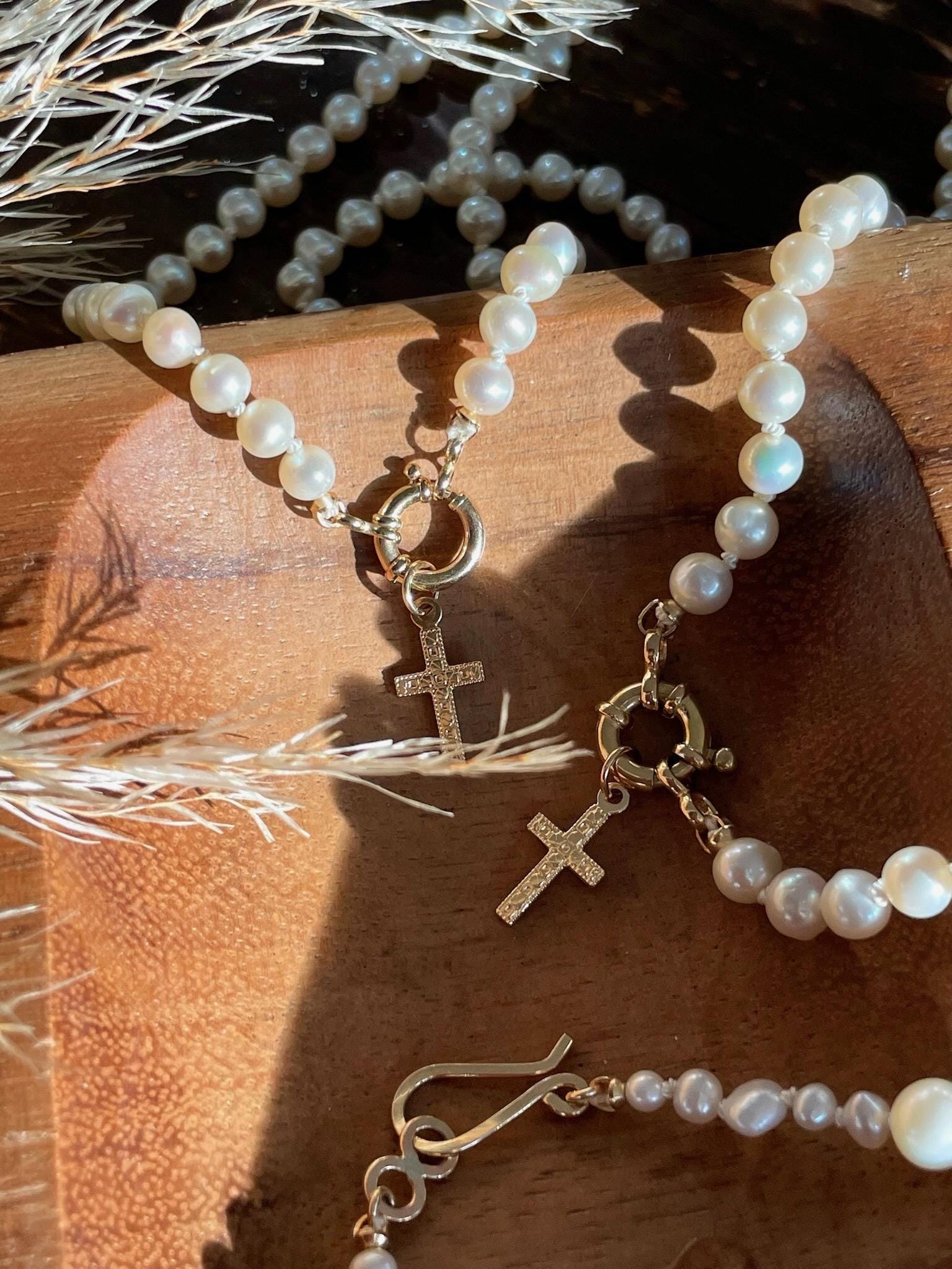 Hand-strung with luminous 5mm pearls and individually knotted on silk for a classic, heirloom finish. Designed with a 14k gold bolt clasp and accented by a 14k gold-filled cross charm, this piece is available in 2mm × 10mm at 18" or 3mm × 10mm at 19.75", offering two elegant proportions for effortless styling. An ideal gift for Mother's Day, a June birthday or as a bridal gift. It's a true gem that you'll find yourself reaching for time and time again.