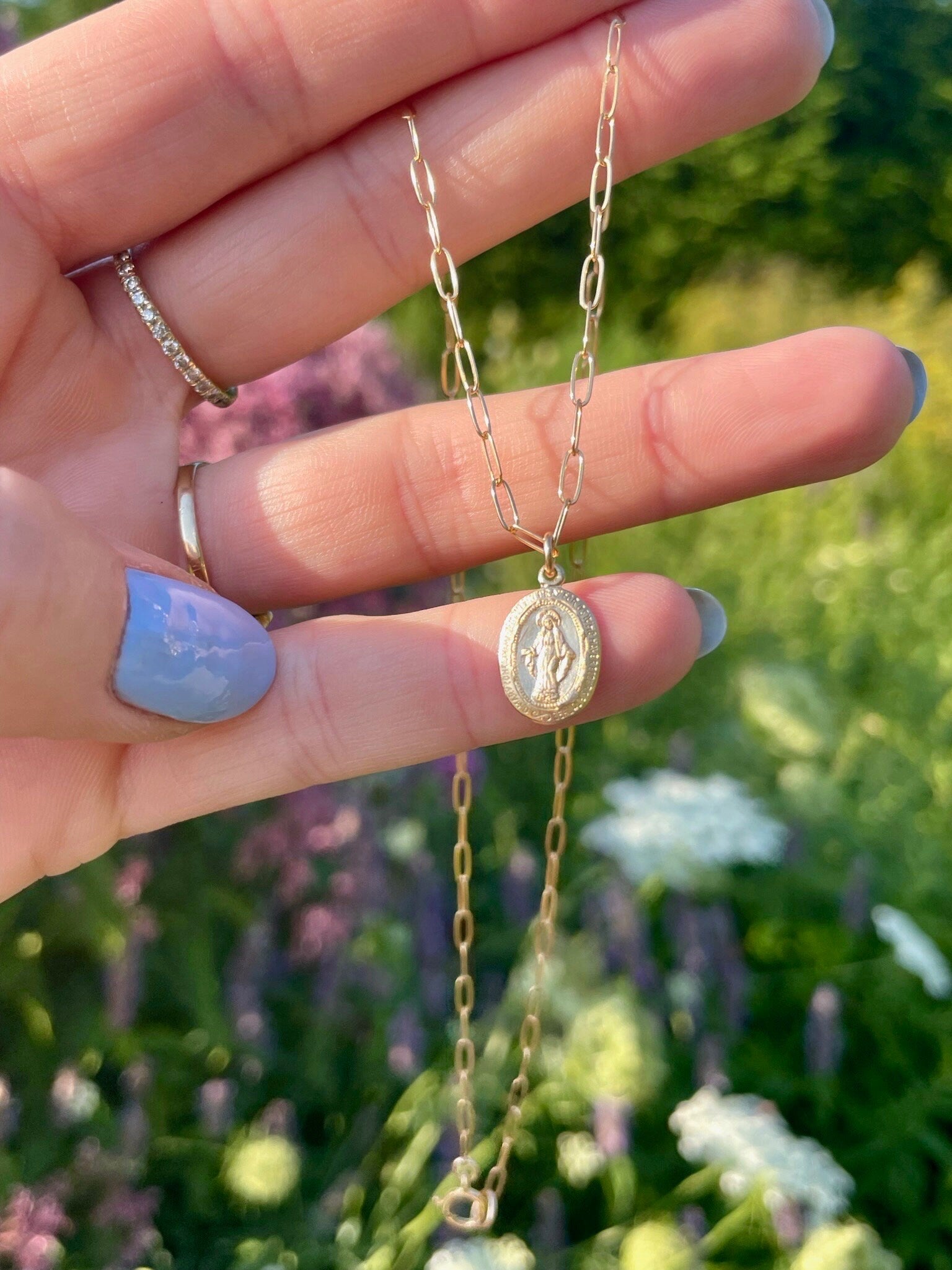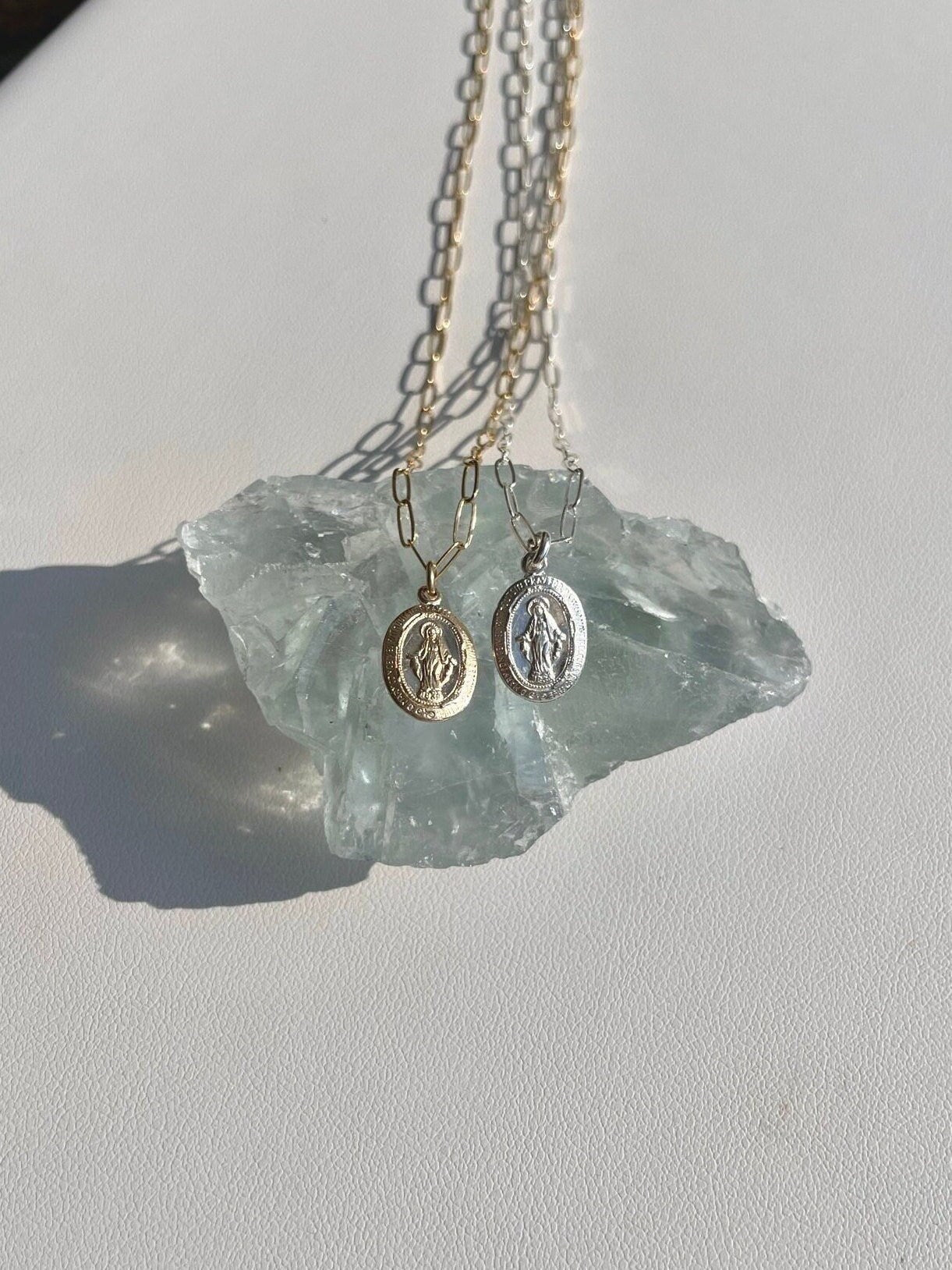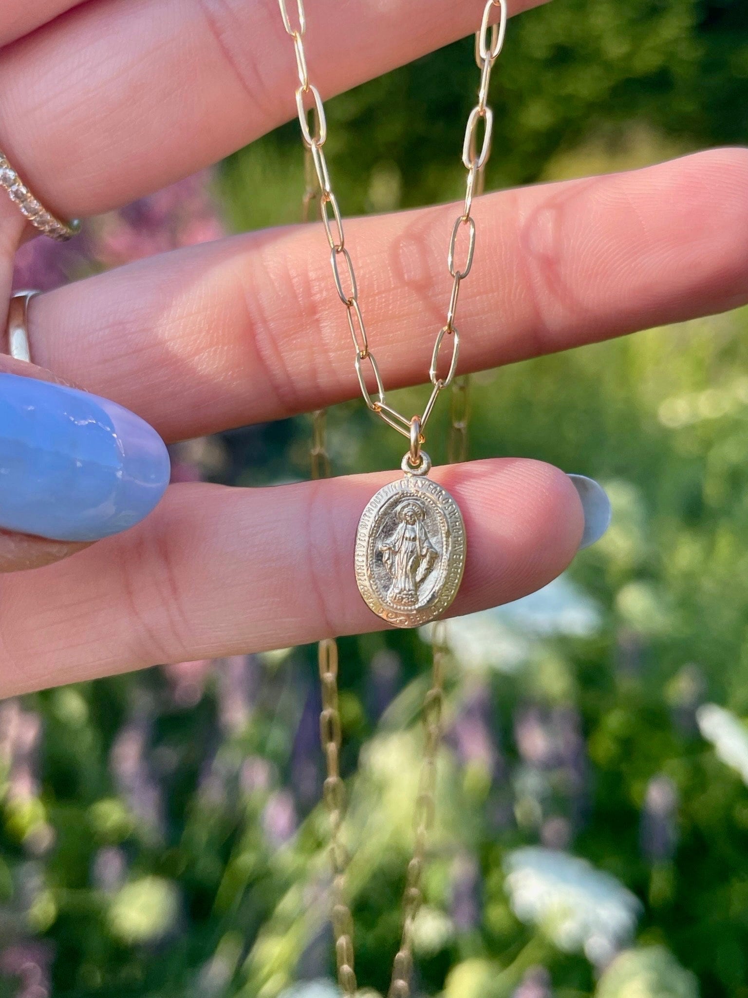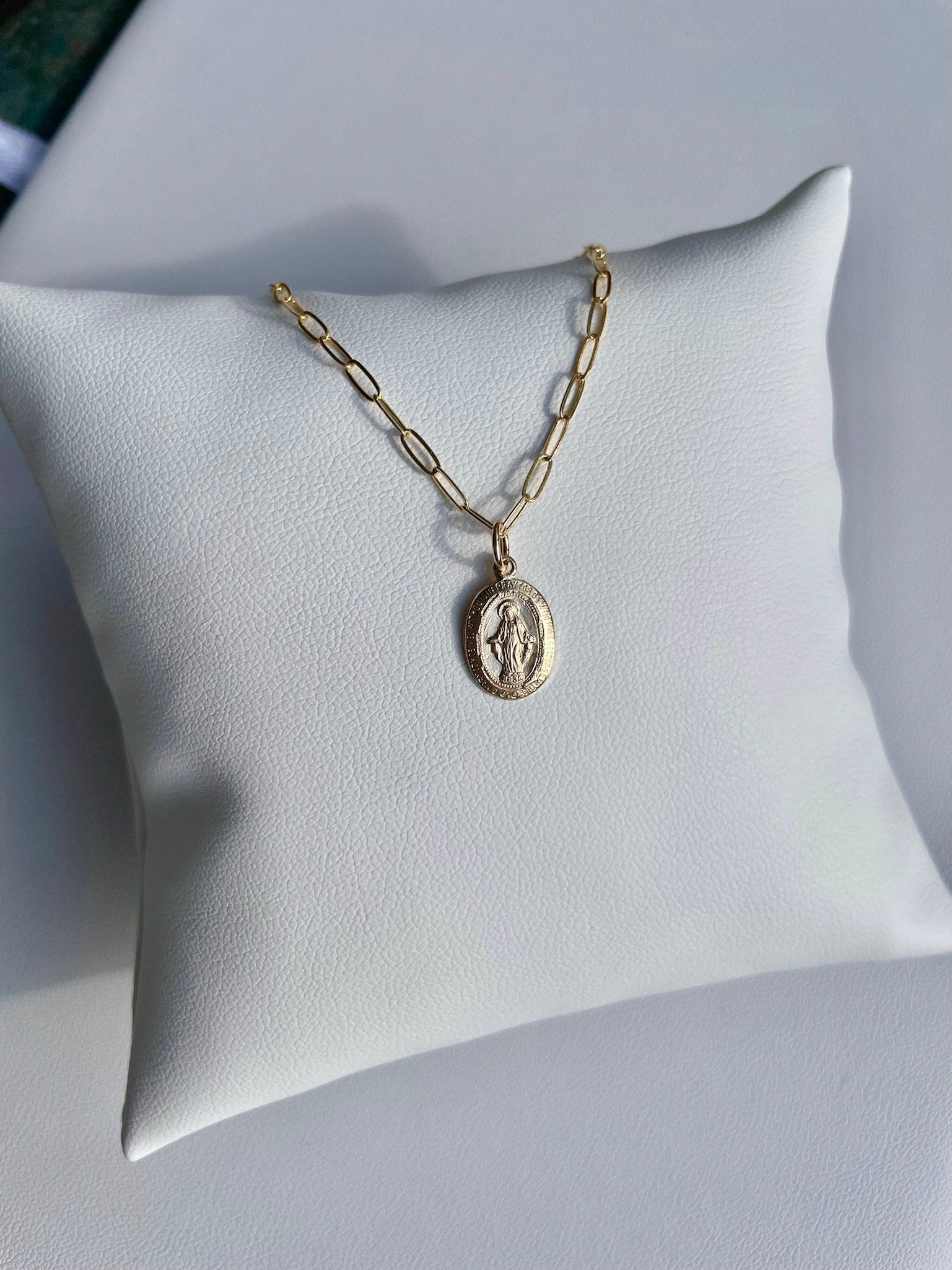 Introducing our Mini Mother Mary Coin Necklace, delicately crafted to adorn your neckline with grace and elegance. This timeless piece features a dainty Mother Mary charm, meticulously detailed and suspended from a gleaming gold filled paperclip chain. Choose your size, finish and chain style. Available in both a 14k gold filled paperclip or cable chain as well as a sterling silver paperclip or cable chain. Enhance your neck with this divine accessory, a symbol of devotion and beauty that transcends time. We also offer our Mother Mary in a larger version in a separate listing if you are looking for a more substantial sized coin.