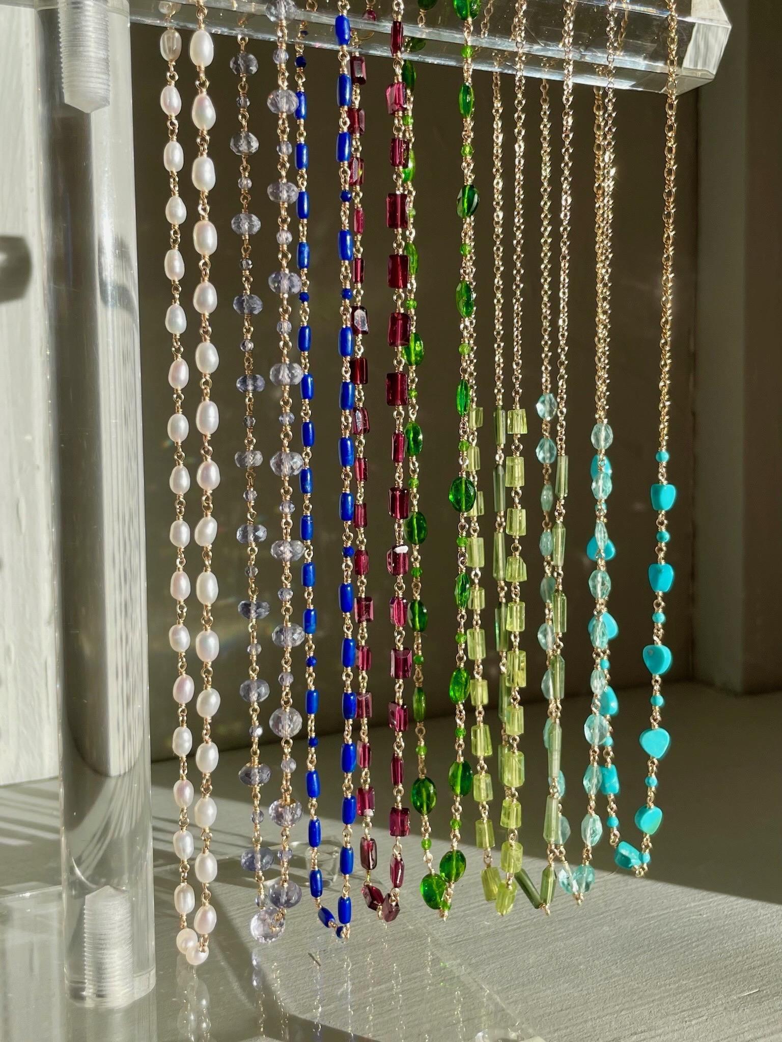 Silk-knotted gemstone necklaces are meticulously crafted with a high level of expertise and attention. Each gem is separated with an individual knot which protects the stones from rubbing against each other. This process takes a considerable amount of time and patience but provides for a flexible, kink-free drape on the body. Each stone sparkles on its own. A silk knotted necklace is truly something special to cherish!