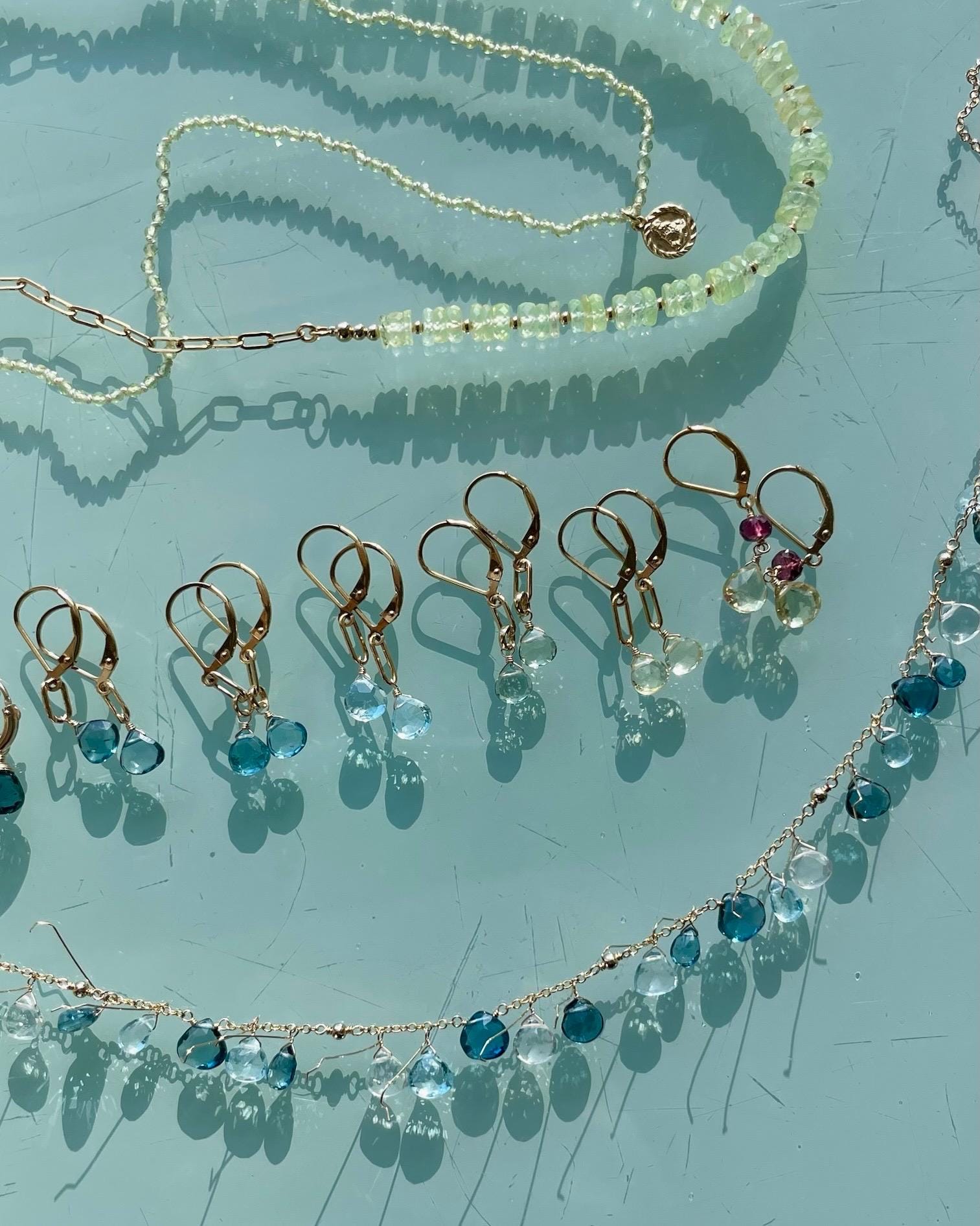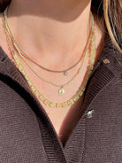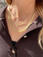 Soft, glowing prehnite gemstones are faceted into heishi beads, offering a fresh, luminous wash of pale green. The stones are strung on thick silver-coated Beadalon and thoughtfully accented with 2mm gold beads placed between every three gemstones for a subtle hint of contrast. An 8" section of gemstones is balanced by 6" of delicate paperclip chain on each side, giving the necklace an airy, modern feel. Finished with an 11mm lobster claw clasp, this 20" necklace is effortless to wear and perfect for layering or wearing on its own.