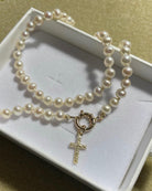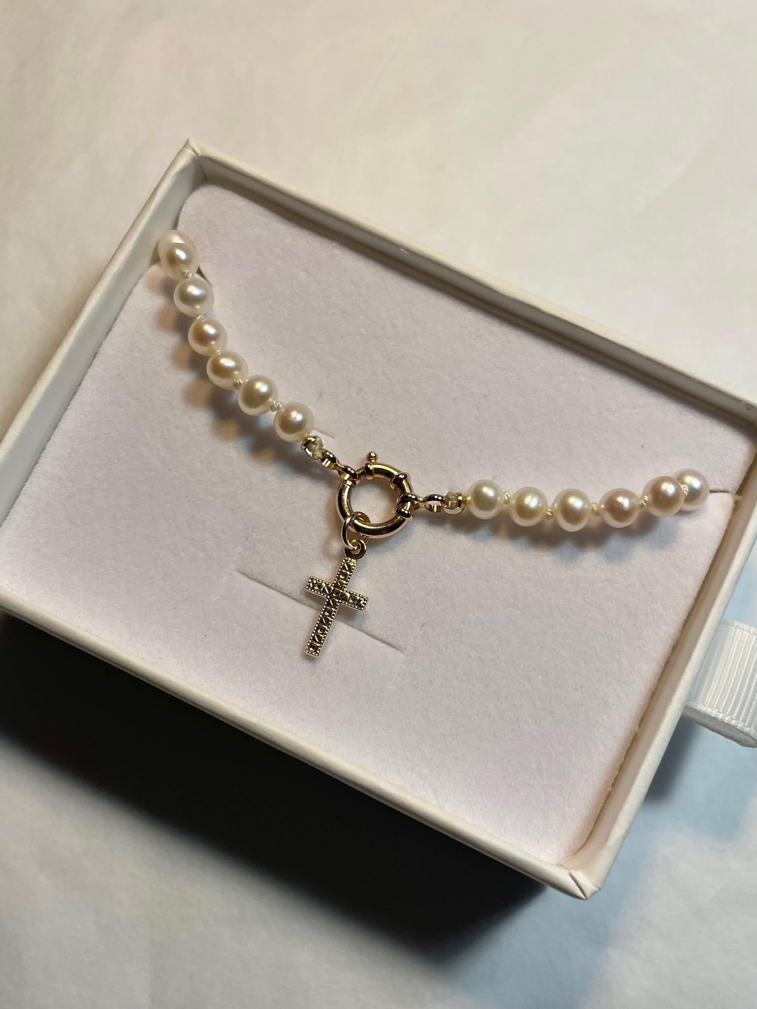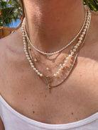Hand-strung with luminous 5mm pearls and individually knotted on silk for a classic, heirloom finish. Designed with a 14k gold bolt clasp and accented by a 14k gold-filled cross charm, this piece is available in 2mm × 10mm at 18" or 3mm × 10mm at 19.75", offering two elegant proportions for effortless styling. An ideal gift for Mother's Day, a June birthday or as a bridal gift. It's a true gem that you'll find yourself reaching for time and time again.