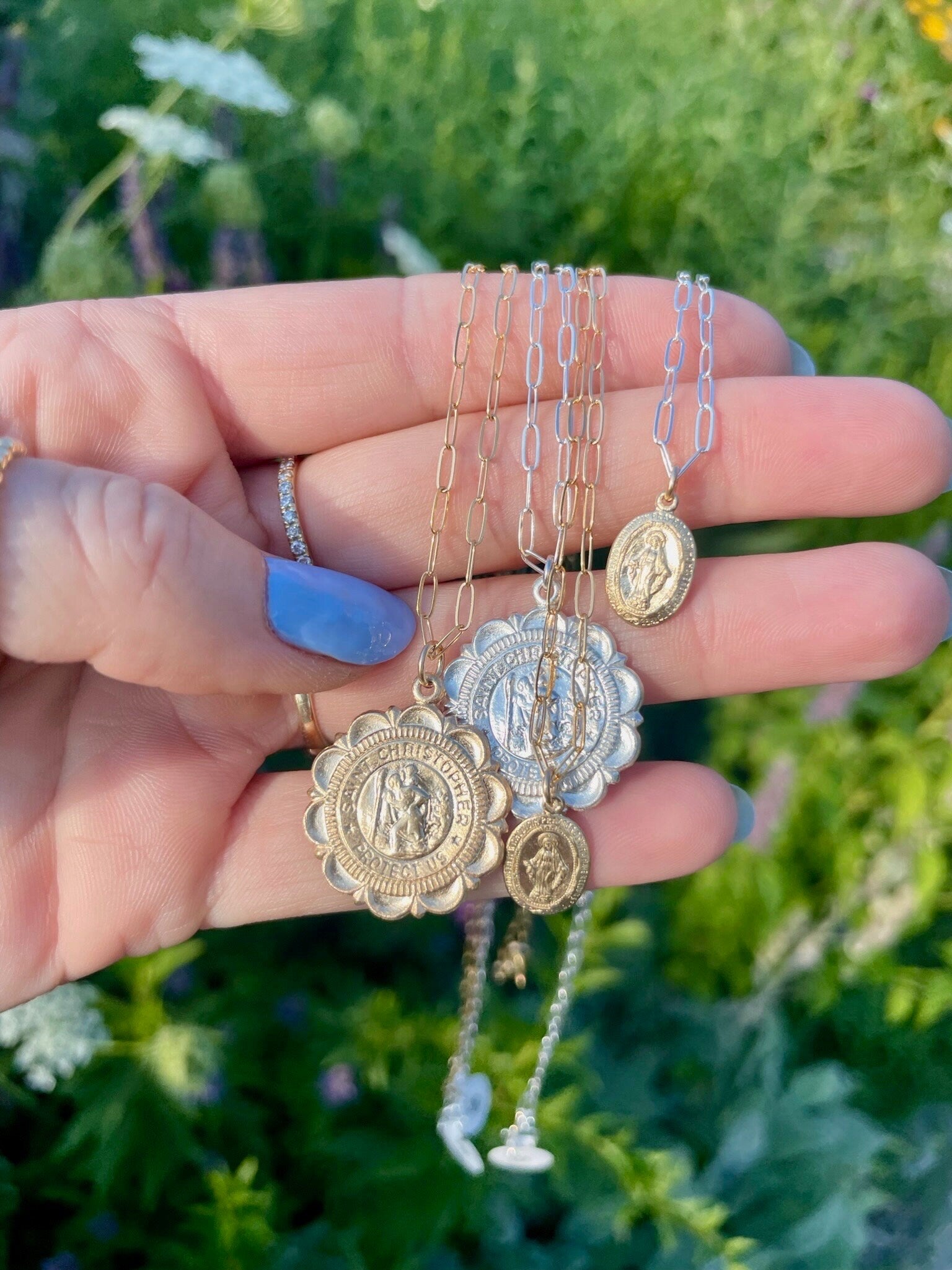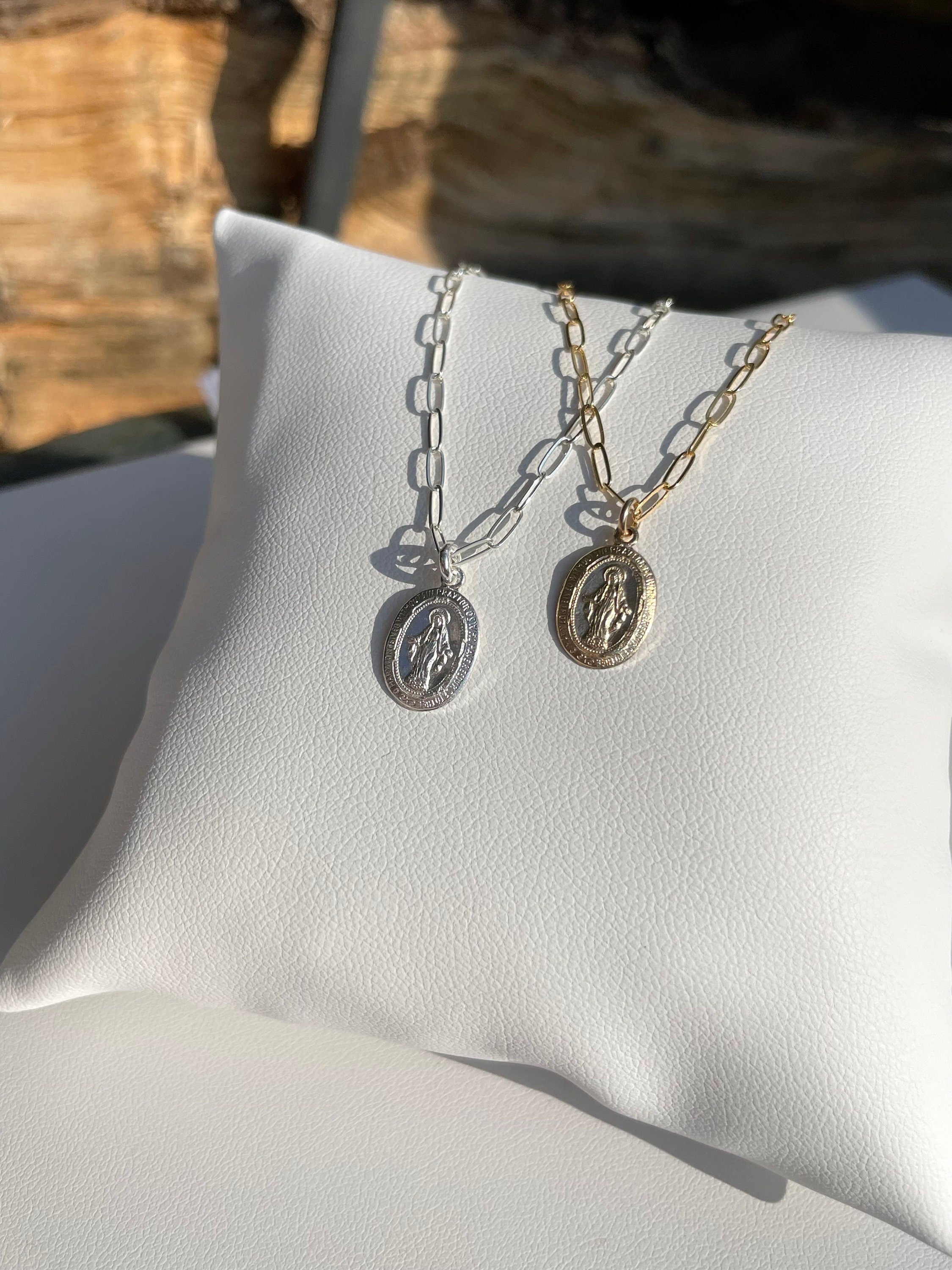Introducing our Mini Mother Mary Coin Necklace, delicately crafted to adorn your neckline with grace and elegance. This timeless piece features a dainty Mother Mary charm, meticulously detailed and suspended from a gleaming gold filled paperclip chain. Choose your size, finish and chain style. Available in both a 14k gold filled paperclip or cable chain as well as a sterling silver paperclip or cable chain. Enhance your neck with this divine accessory, a symbol of devotion and beauty that transcends time. We also offer our Mother Mary in a larger version in a separate listing if you are looking for a more substantial sized coin.