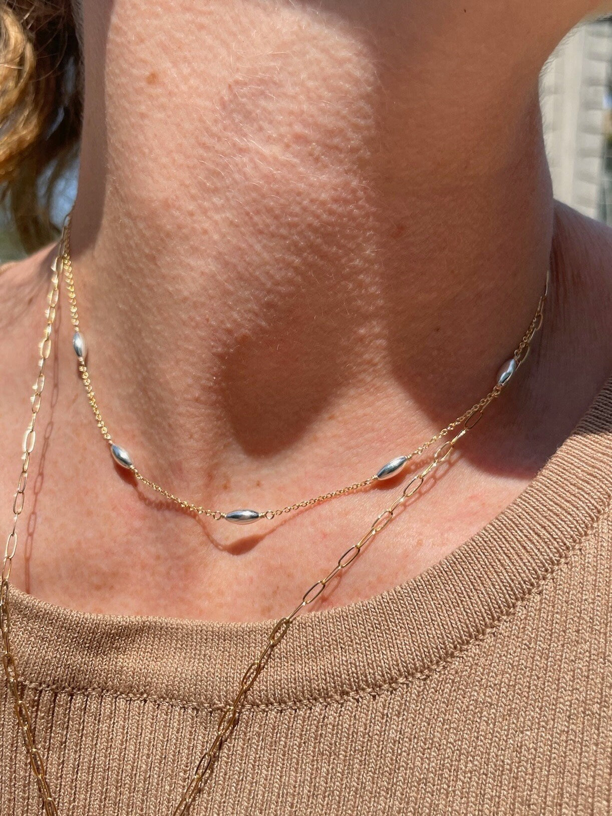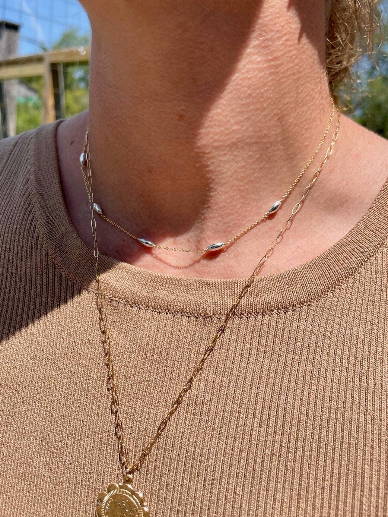 Shimmery sterling silver ovals set into a fine 14k gold-filled chain. Perfect for any occasion, this versatile piece transitions effortlessly from day to night. Wear it alone for a minimalist look or layer it with any of your other favorite necklaces.